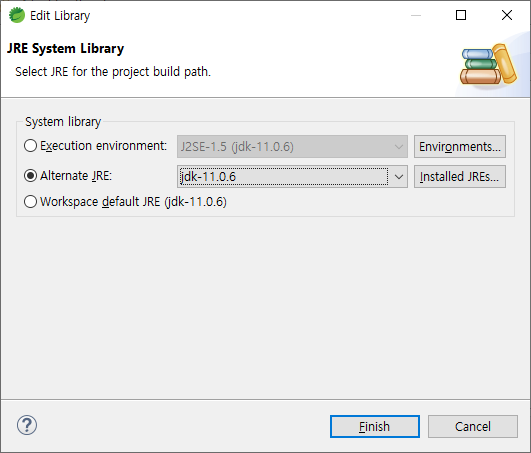 (프로젝트 우클릭 > Properties > Java Build Path > Libraries 탭 > JRE System Library > Edit 버튼)