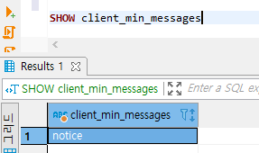 client_min_messages 을 warning 으로 변경하여 쿼리를 실행하면 WARNING 로그만 표시되는 것을 확인할 수 있다.