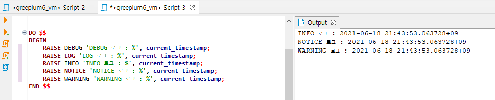RAISE NOTICE 'NOTICE 로그 : %', current_timestamp;