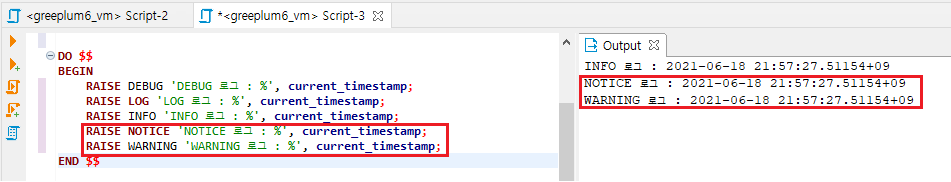 RAISE WARNING 'WARNING 로그 : %', current_timestamp;