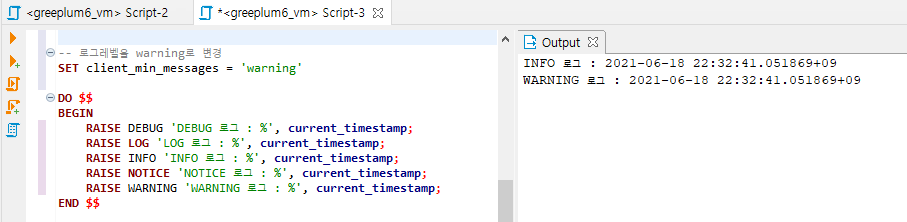 client_min_messages 파라미터 값이 notice 으로 설정되어 있어 1번의 DO 구문실행시 NOTICE 로그와 NOTICE의 상위레벨인 WARNING 로그가 표시가 된것이다.