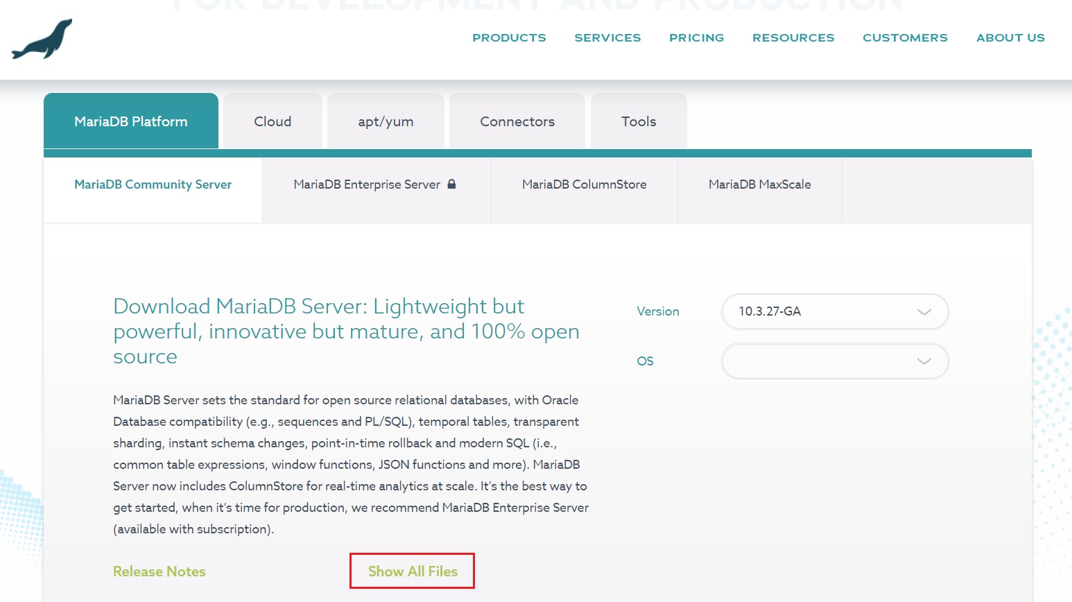 mariadb.com/downloads/ 접속하여 'Show All Files' 를 클릭한다.