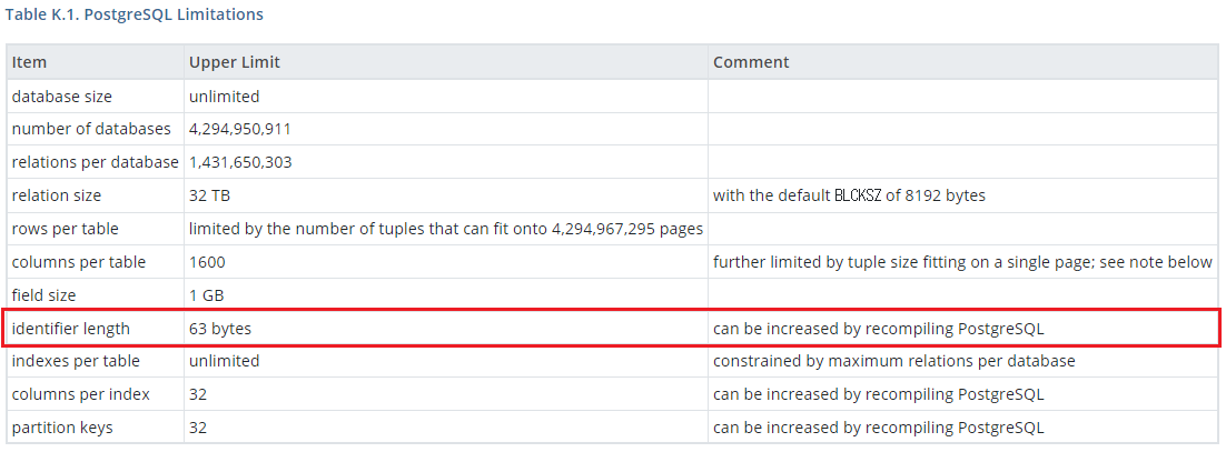 Postgresql 제한관련 정보 - https://www.postgresql.org/docs/13/limits.html