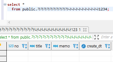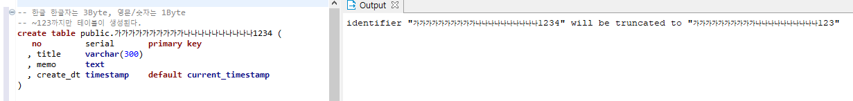 SQL경고메세지 : identifier "가가가가가가가가가가나나나나나나나나나나1234" will be truncated to "가가가가가가가가가가나나나나나나나나나나123"