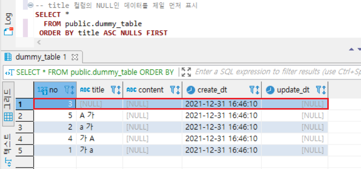이 상황에서 NULLS FIRST 명령어를 사용하면 NULL인 데이터를 제일 먼저 정렬되게 변경할 수 있다.