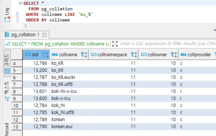 당연히 ko_KR 만 지원하지는 않고 상당히 많은 collate를 지원하며 pg_collation 카탈로그 테이블을 조회하면 지원가능 collate를 확인할 수 있다.