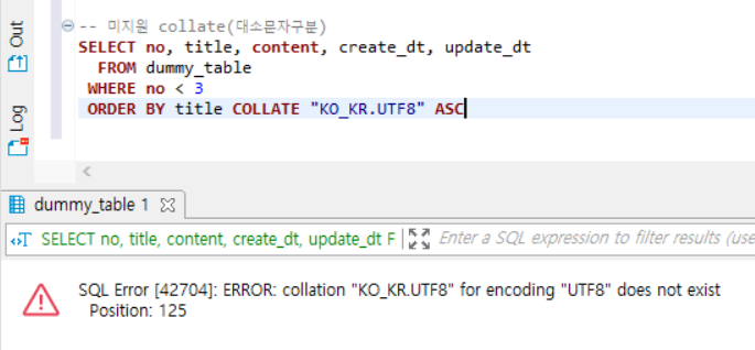대소문자를 정확히 구분하지 않거나 지원하지 않는 collate를 지정하면 SQL 42704 ERROR가 발생한다.