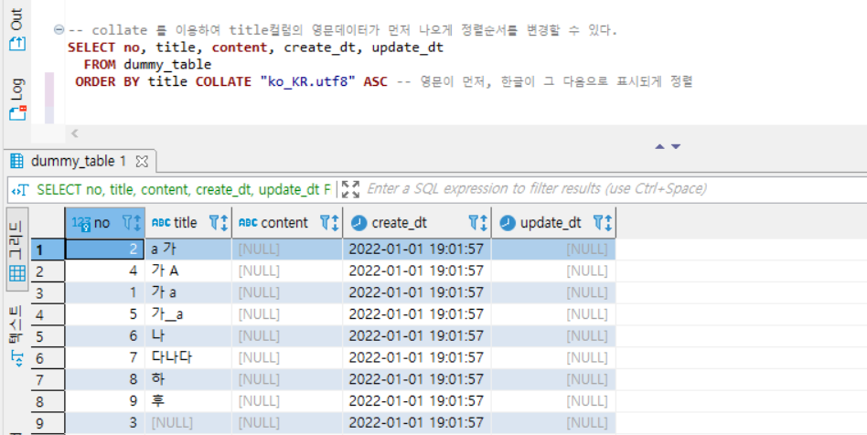 -- collate 를 이용하여 title컬럼의 영문데이터가 먼저 나오게 정렬순서를 변경할 수 있다.