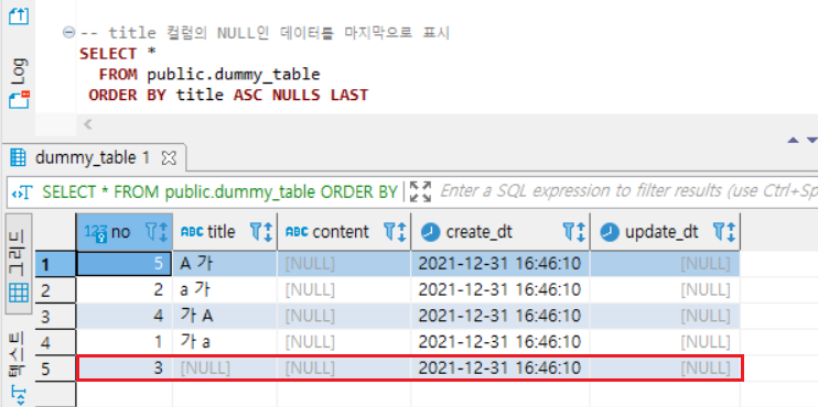 3. 기존 DBMS에서 사용하던 쿼리를 실행하였는데 특정컬럼의 NULL 인 데이터가 제일 상단 또는 하단에 표시되어 데이터검증 자체가 안되는 경우