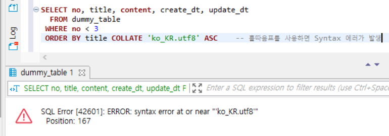 유의사항은 DB collate가 ko_KR.utf8 으로 설정되어 있으면 ko_KR.euckr 로 정렬기준을 변경할 수는 없는 것으로 파악이 된다.
