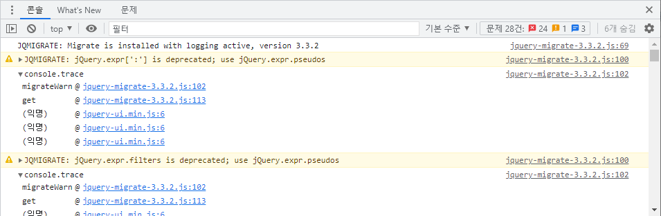 하지만 jQuery Migrate를 이용하여 웹개발을 하게 되면 브라우저 콘솔 창에 어마어마하게 많은 trace 로그가 생성되는 것을 볼 수 있다.