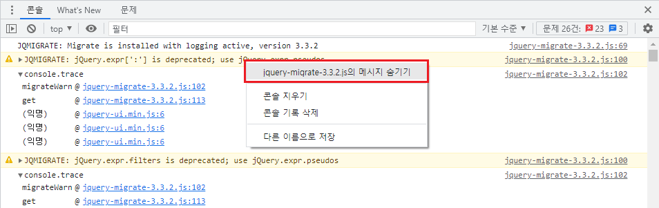 trace 설정이 꼭 필요하여 공통으로 설정되어 있으면 크롬 콘솔창에서 해당 로그에서 우클릭 > jquery-migrate 메세지 숨기기 기능을 이용하면 된다.