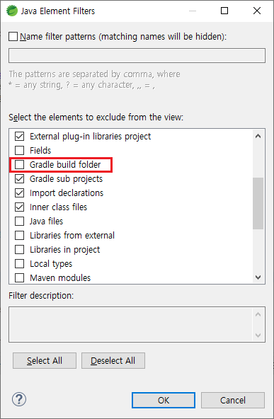 Package Explorer - Filters 설정에 Gradle 프로젝트이면 build 폴더를 아예 안보이게끔 기본설정이 되어 있는데 이 설정을 변경하면 폴더를 확인할 수 있다.