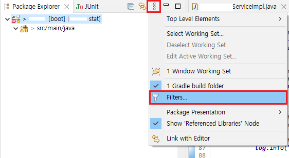 Package Explorer 창 > 우측상단 ... > Filters 클릭