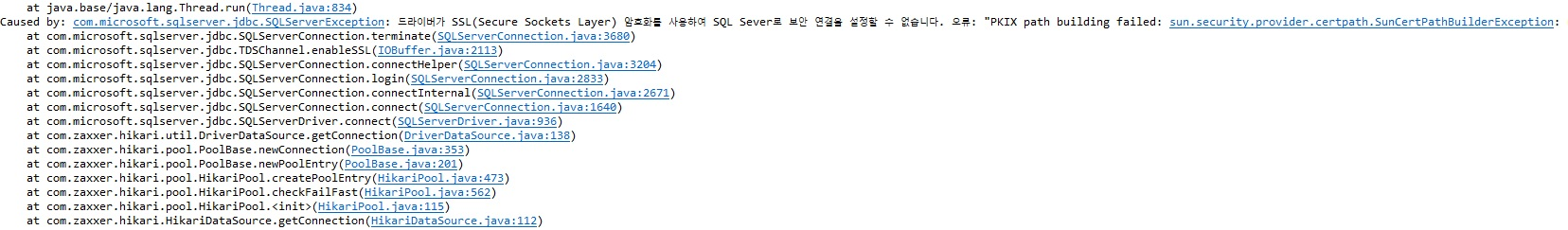 com.microsoft.sqlserver.jdbc.SQLServerException: 드라이버가 SSL(Secure Sockets Layer) 암호화를 사용하여 SQL Sever로 보안 연결을 설정할 수 없습니다. 오류: "PKIX path building failed: sun.security.provider.certpath.SunCertPathBuilderException: unable to find valid certification path to requested target". ClientConnectionId:8a029f18-fb62-4a3c-9cc2-ada2c5452653
