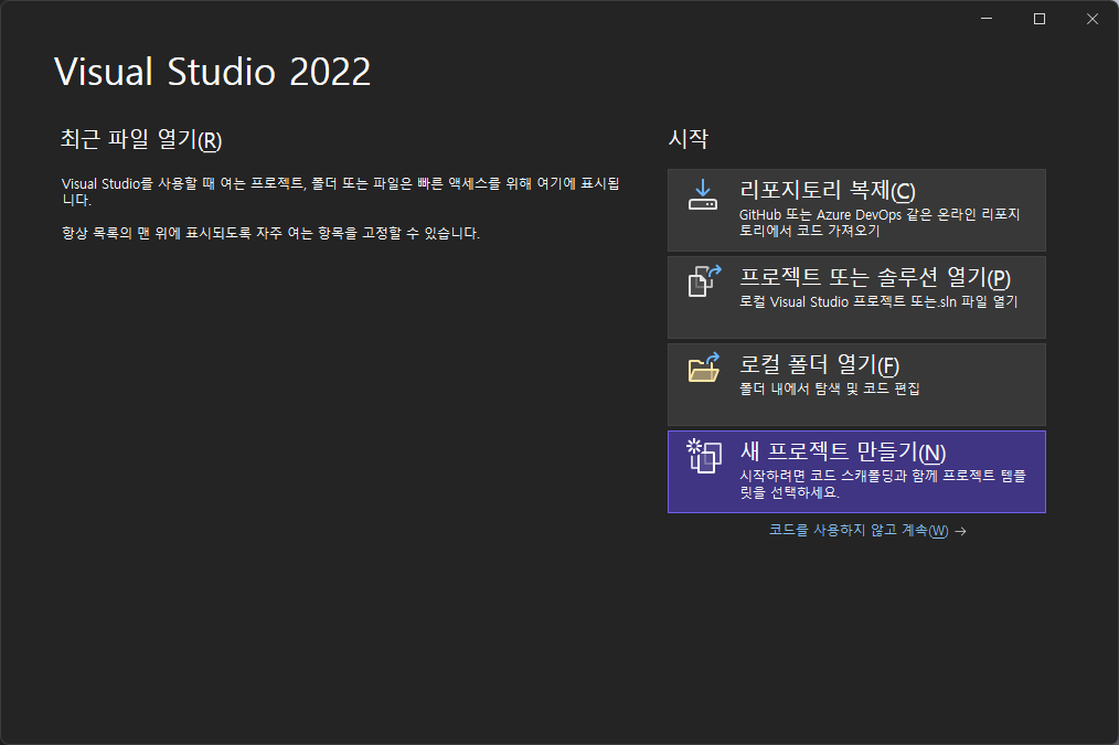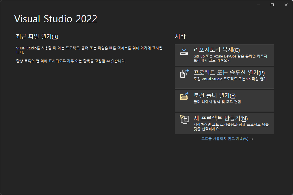 Visual Studio 2022 커뮤니티 버전 설치가 완료되어 첫화면이 표시되었다.