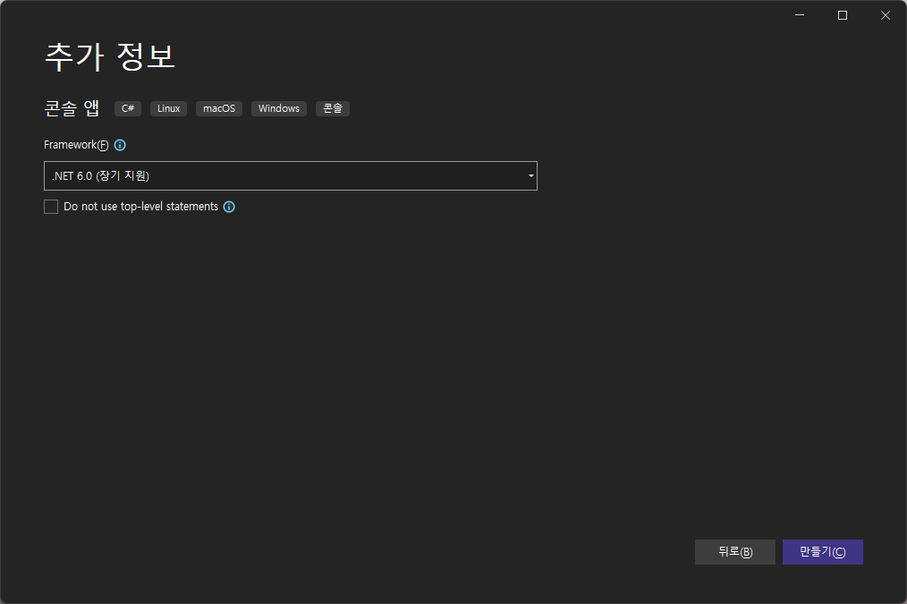 Framework - .NET 6.0(장기 지원) 선택 후 만들기