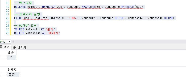 EXEC [dbo].[TestProc] @pTestId = 'ID값', @oResult = @oResult OUTPUT, @oMessage = @oMessage OUTPUT