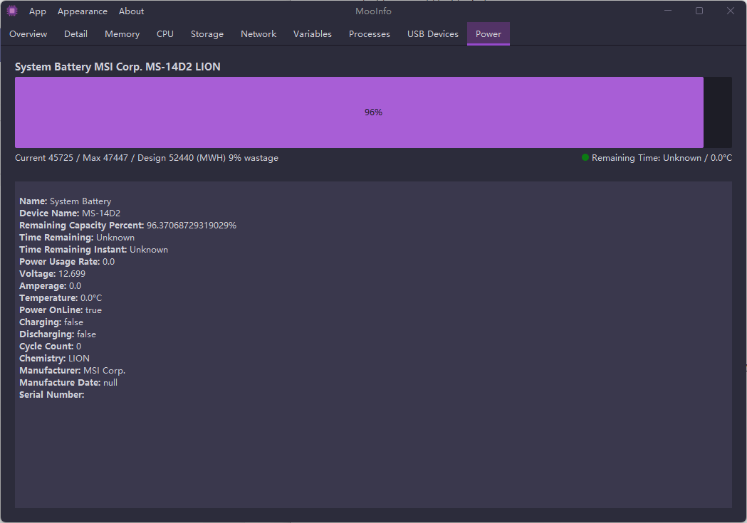 - Overview, Detail, Memory, CPU, Storage, Network, Variables, Processes, USB Devices, Power - 총 10개 탭으로 구성