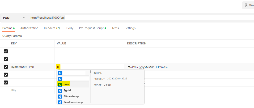 [Postman] URL 호출시 현재일시를 파라미터로 지정하는 방법