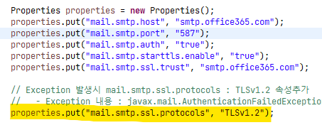 메일발송 프로토콜을 TLS 1.2로 지정해 주면 문제가 해결된다.
