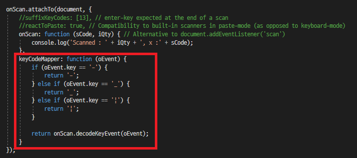 하지만 숫자와 영문은 문제없이 잘 작동하나 _(언더바), -(대시), |(파이브)는 인식이 안되는 문제가 발생하는데 onscan.js에서 제공되는 attachTo 메서드에 keyCodeMapper 옵션을 적용하면 언더바, 대시, 파이브가 정상적으로 인식되게 수정할 수 있다.