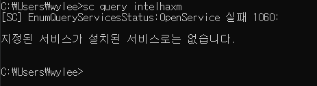 윈도우 커맨드로 sc query intelhaxm 를 입력하여 서비스를 확인