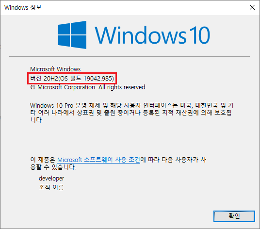 윈도우 실행(윈도우키 + R) -> winver 입력 후 엔터 -> OS버전을 확인