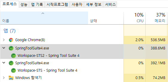 예전 윈도우 환경에서는 STS 2개이상 실행이 안되고 하나만 실행할 수 있는 줄만 알았지만 최근(?)에 확인해 보니 중복으로 실행할 수 있는 방법을 알게되었다.(예전에는 STS를 2개 설치하여 실행하는 방법을 사용하였다.;;;)